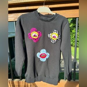 Stylish black sweatshirt featuring vibrant flower patches in purple, yellow, and blue. Perfect for a casual look.