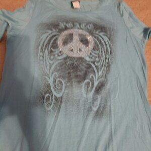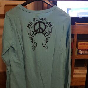 Katydid Light Blue Embellished Peace sign on the front of this long sleeve shirt. Peace sign in black also on the back. Fitted tee 20" across the chest / approx. 27" in length. Size 2XL.