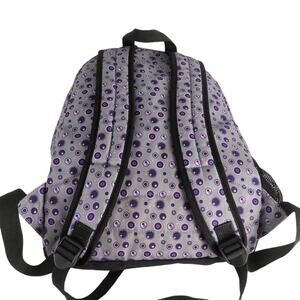 Features adjustable padded shoulder straps, top handle, large chunky zippers, 1 side mesh bottle pocket, front zippered compartment with removable key fob, large main compartment with inside zippered pocket at top, Plum Dot print 100% polyester canvas fabric. Measures 16" tall, 12" wide, 6.75" deep at base.