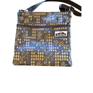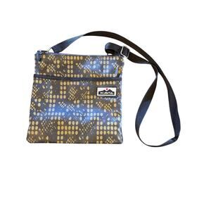 This functional and fun KAVU crossbody bag features a unique abstract print with mustard yellow ovals, dots, and diamonds set against a deep navy or charcoal background. The design offers a modern, geometric flair that’s perfect for everyday wear or outdoor adventures. Includes an adjustable strap, front zip pocket, and KAVU patch logo.