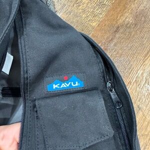 This cotton canvas sling features an adjustable rope shoulder strap with side release buckle, two vertical zip compartments, two key or cell phone pockets, and a padded back with KAVU embroidery.
