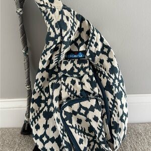 This cotton canvas sling features an adjustable rope shoulder strap with side release buckle, two vertical zip compartments, two key or cell phone pockets, and a padded back with KAVU embroidery.