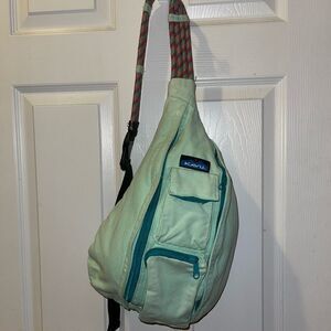 KAVU Rope Canvas mint Green Sling Bag Crossbody Backpack two small front pocket two side zipper padded bag.Pre owned in good used condition small bleach stains on the canvas.See all pictures any questions please message.M8