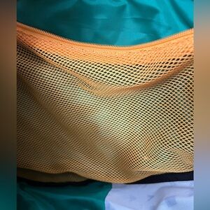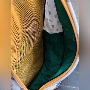There is a light stain on the front pocket and some small stains on the bottom, but it is in good condition.