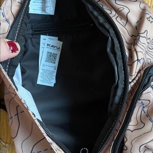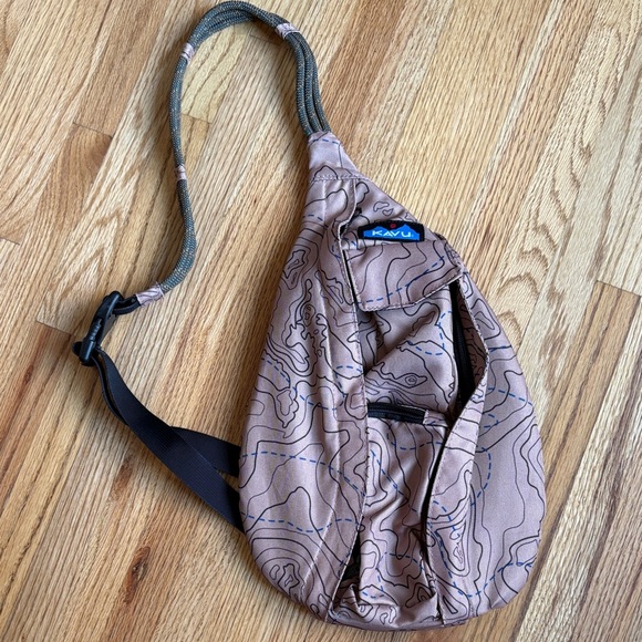 Single-strap sling with rope shoulder strap. Topographic print on dusty rose fabric. Multiple exterior zip and flap pockets. Casual, hands-free carry.