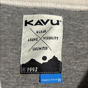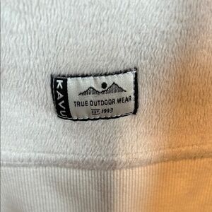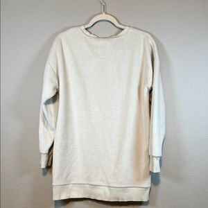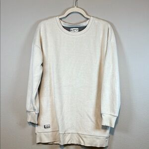 KAVU Women's Riverton Sweatshirt beige, extra-long with side pockets and a soft texture, size M. Remain cozy with this cream sweatshirt from KAVU. Inside has a t-shirt type material. Arm pit to arm pit measurement: 21.5". Measurements taken manually, please allow for the possibility of human error.