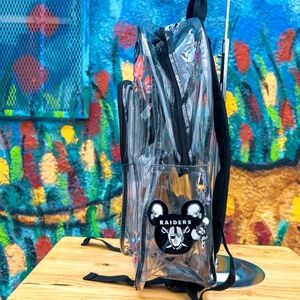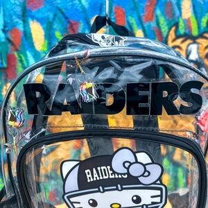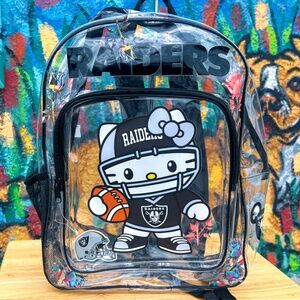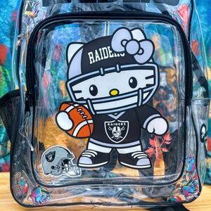 Elevate your everyday style with the HELLO KITTY RAIDERS Clear Backpack, custom handmade by NewNorthVintage. Crafted with durable clear PVC material, this 15” x 12” backpack offers both visibility and function. The sleek black trim beautifully contrasts with the iconic HELLO KITTY RAIDERS logo, accentuated by a striking chrome rose embroidery, making it a must-have for collectors and fashion enthusiasts alike