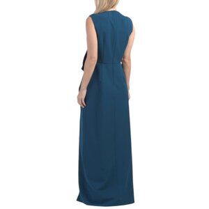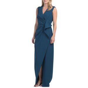 fully lined, front slit, gathered side, ruffle detail, fabric provides stretch
