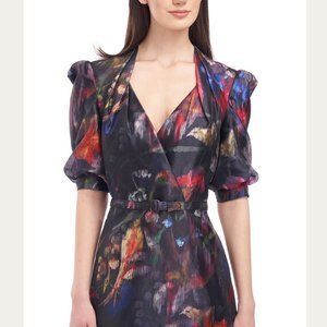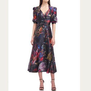 Watercolor floral tea length dress on printed lurex organza with a faux surplice pleated bodice.