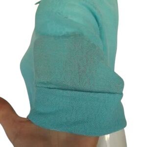 Aqua Blue color in what feels like a poly or an acrylic. Washable.
