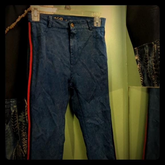 Blue stretchy jeans with red and green line on the sides with gold color buttons