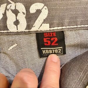 KB8782 Jeans 50x29 Gray, Back Flap Embroidered Pockets (Tag Size 52) Straight Leg, Urban, Streetwear, Hip Hop, Rap, Skate, Baggy Y2K Style. Preowned. Gently worn. The left front pocket is frayed. Otherwise they are in nice condition. Smooth, medium weight denim. 100% Cotton.