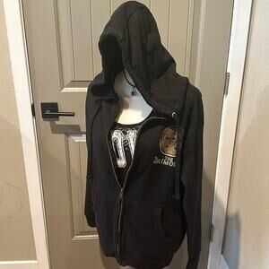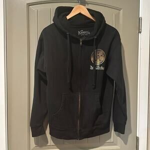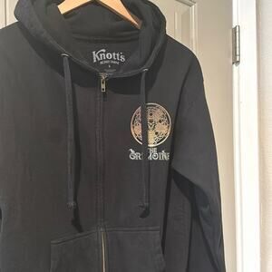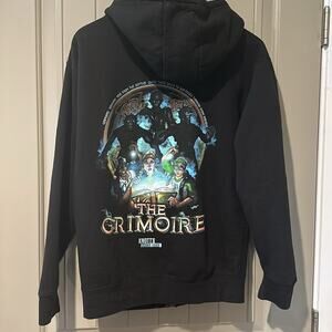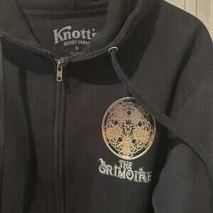 California’s Knott’s Berry Farm THE GRIMOIRE Hoodie, size Small. Perfect for Halloween. Knott’s Scary Farm exclusive merch. Worn once and washed, but please note a small area of discoloration on right upper chest, (4th pic). Black, full-zip, hoodie. Unisex.