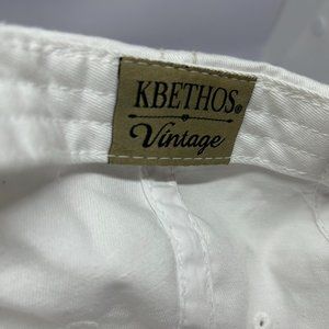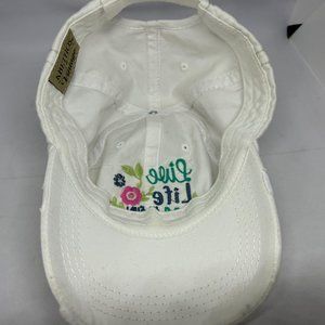 KBethos Vintage White Ball Cap "Live Life in Full Bloom" OS. Distressed style, hard bill, adjustable velcro strap, embroidery on hat. Pre-owned in good condition.