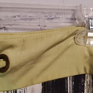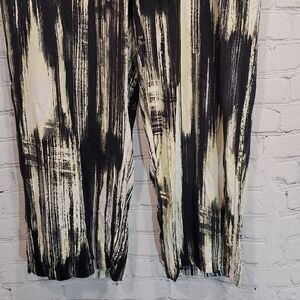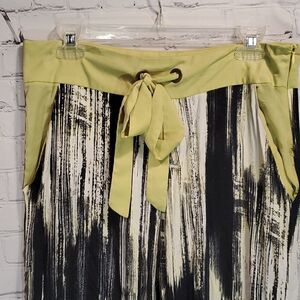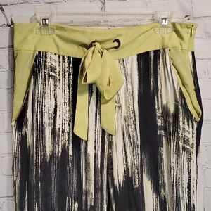In good used condition repair made at the hip zipper zipper still functions as it should. Piling along the waistband. No material tag have a silk feel but I cannot verify. Lime green with front and back pockets. Bottoms are black, green, and white. Super lightweight pull on with a functional drawstring. Waist measures about 16.5 inches.