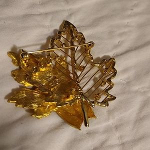 Leaf skeleton with tiny autumn colored stones, solid leaf and enameled acorns. 2 1/2 x 2 1/2. Bar clasp.