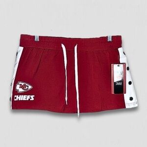 This officially licensed NFL mini skort in red and white is designed for comfort and style. It features snap-button side panels, an elastic waistband, and the KC logo on the front.