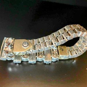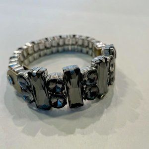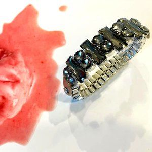 KC (Techno Com). This good looking bracelet fits smalls and medium wrists. Made of white metal stainless, decorated, faceted smokey large baguette rhinestones, round cabochons in geometric design. Marked in etch monogramming .. Excellent condition, in tact. mini screws a symmetric. Larger cabochons are about one inch each. rounds about 4 mm. 2.5 inches diam. strechy to fit wrists, with elastic thread