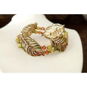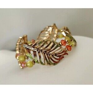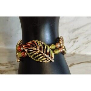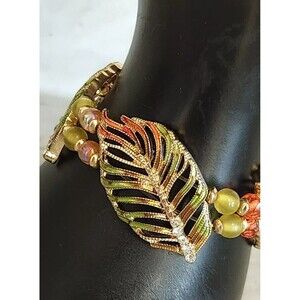 KC Stamped Gold Tone Enameled Leaf Beaded Rhinestones Small Stretch Bracelet