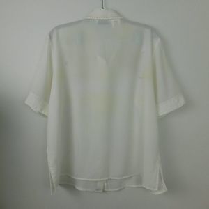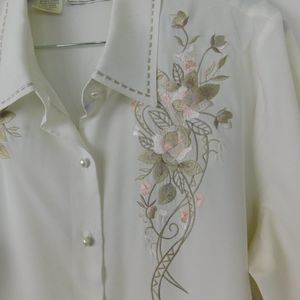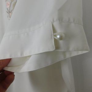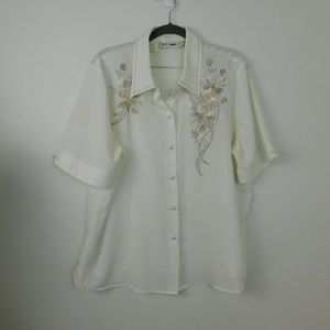 Cream colored silky blouse with embroidery on the front.