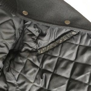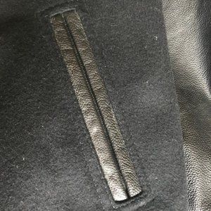 Quilted lining; fully-lined including sleeves; outer shell is wool blend with leather sleeves. Leather trim on all pockets including inside pocket. Please contact me with any questions you may have.