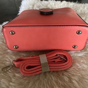 This is a K .Carroll Coral color purse.Gorgeous color has many compartment's come's with a coral attach cross bodyStrap and a silver link chain strap. Nice bag for a night out this is not leather It is Designed with a RFID Protected Card holders.