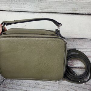 Stylish and functional, this K. Carroll Accessories crossbody bag in olive green is crafted with vegan leather and detailed with silver-tone hardware. It features a top handle and a detachable/adjustable crossbody strap measuring approx. 48", offering versatile carrying options. With multiple zipper compartments, including a front pocket and two roomy main compartments, it’s perfect for staying organized on the go.