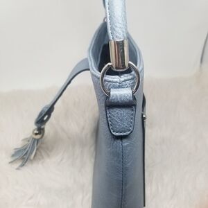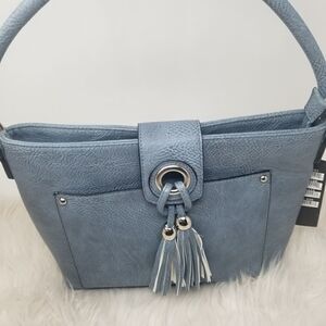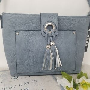 Pretty blue handbag with a nice tassel as a focal point on purse. New condition. Approximate measurements are 13" x 9" x 3". New, never used.