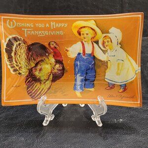 A vintage glass plate by K.D. Design with a charming postcard print designed on glass. On the left bottom of the design is the name S. Garre c. 19O8 The right hand side is the signature Ellen Clapsaddle. This cute plate features a couple of young, perhaps farm kits feeding a turkey grain. The plate is in very nice vintage condition. No chips or brakes. Measure 6 5/8 inches wide 4 1/4 inches high. 5/8 inches deep. Note, stand not included. Non smoking pet free home. @ ER HW Box #3