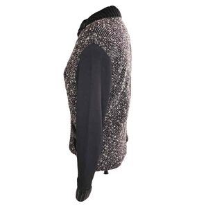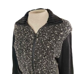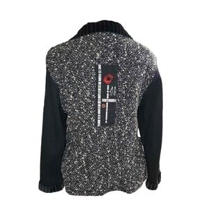K.d. Spring black, white and red boucle/ velvet jacket with graphics on pocket and back, cotton sleeves and zipper closure.