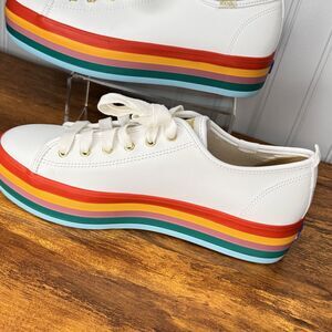 The KEDS Sz 9 Triple Up Leather Platform Sneakers in Rainbow White Multicolor are a stylish and comfortable pair of athletic shoes perfect for casual or activewear occasions. Featuring a low top sneaker style with a lace-up closure, these sneakers are made with leather upper material and a foam insole for added comfort. The multicolor rainbow stripe pattern adds a fun and vibrant touch, making these sneakers a trendy choice for women looking for a Y2K retro-inspired footwear option. Perfect for walking, school, or cross-training activities, these KEDS sneakers are a fashionable and practical choice for everyday wear.