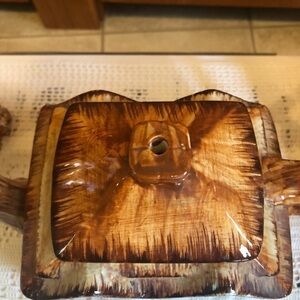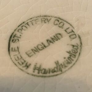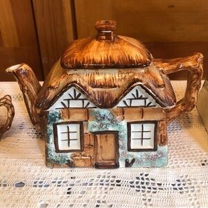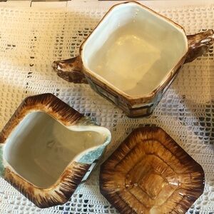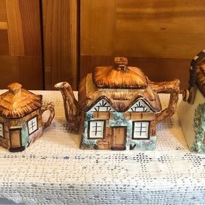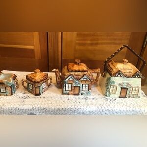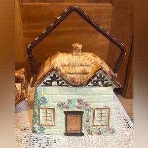 KEELE ST.Pottery,CO. LCD/ ANTIQUE England/ TEA SET AND COOKIE JAR WITH-HANDLE hand painted Tea Pot/w cookie jar/cream/sugar /HAND PAINTED IN England/ sat in moms cabin set fOR 30 years! So beautiful! Perfect wife for antique seller or mom or aunt grandma or yourself. I have too much / NO CRACKS OR CHIPS!