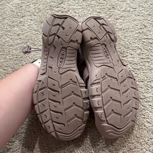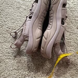 KEEN Bungee Lace Women's Outdoor Hiking Sandals in Size 10. Manufacturer calls these colors Monochrome / Toadstool; they are a like mauve-y pink purple, in my opinion, but please know naming colors is so subjective and see pictures for color. Shoes are in very good used condition with minor signs of wear, including one small black scuff near one toe. Closed toes, machine washable, high quality, supportive footwear. Please see close-up pictures for condition details and heel measurements.