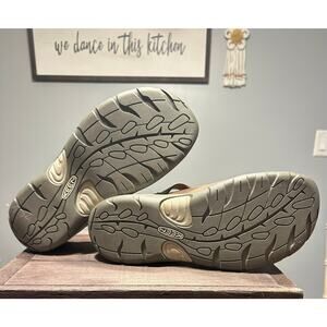 Comfy, cute KEEN Mary Jane flats in a versatile taupe/tan leather. Signature KEEN protective toe bumper, cushioned footbed, and grippy rubber outsole—perfect for all-day wear (teaching, travel, errands). Adjustable buckle strap for a secure fit. Clean insoles and excellent tread.