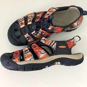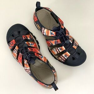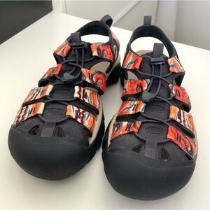 Brand new with box and packaging water-resistant upper sandal made with washable polyester webbing for in and out of the water. PFC-free with multi-directional lugs with siping to provide superior traction/grip on wet terrain. A non-marking outsole that leaves no imprint walking outdoors, iconic toe bumper for additional safety and injury prevention, and a lace-lock bungee capture system for a secure fit and quick and easy on and off. With a quick-dry lining, the iconic KEEN Original Fit, and a non-removable footbed with extra arch support providing all-day comfort. In color Groovy Orange/Navy.