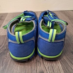 The KEEN Seacamp II Cnx Youth Size 6 sandals in blue and green are slip-on sandals perfect for travel, activewear, and casual occasions. These adjustable strap sandals feature a round toe shape, moderate cushioning, and a waterproof rubber outsole, making them ideal for summer, fall, and spring activities such as hiking, water sports, and walking. The breathable fabric lining and synthetic upper material ensure comfort and durability, while the solid blue color with logo accents adds a stylish touch for boys on the go.
