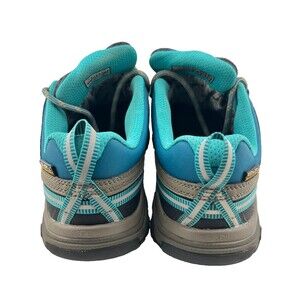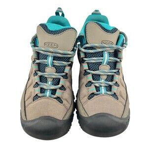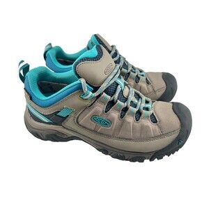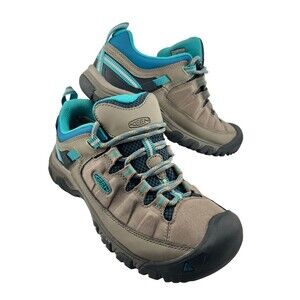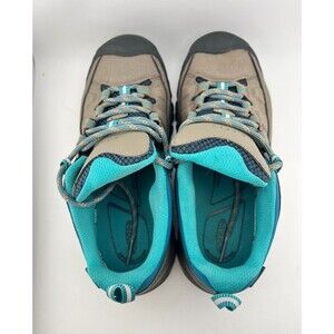 These show a light amount of dirt on the top of the tongue, otherwise in near pristine condition! Keen Targhee III, low hikers for women, in size US 7. Colors are taupe brown and teal blue with black toe and treads. Lace up front, arch support soles and feature KEEN DRY Waterproofing.