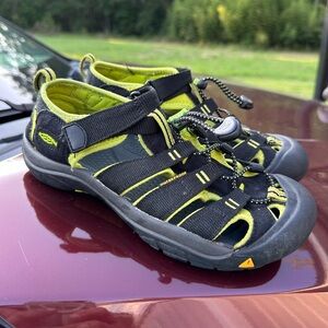 Durable KEEN sandals for women. Black with lime accents. Perfect for outdoor adventures. Adjustable fit. In good condition, with good tread. See photos for details. All items come from a smoke-free home. Thank you for visiting. Item(s) exactly as shown in the photos. See all photos for complete condition and details. If the item is used, any defects will be shown in the detailed photos