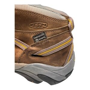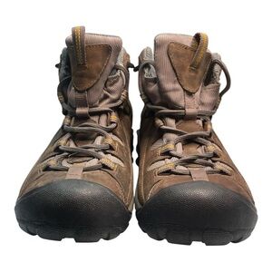 Stylish KEEN lace-up boots. Brown leather with gray soles. Perfect for outdoor wear.
