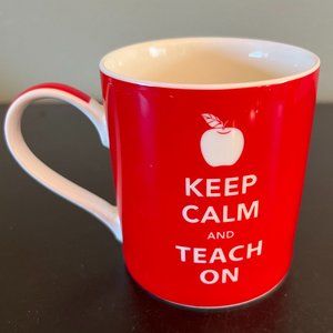 Charming bright red ceramic tea mug with the famous motivational British saying, just altered a bit. Both sides feature a graphic of an apple with white capital letters that read: KEEP CALM AND TEACH ON. By Home Essentials. Dishwasher and microwave safe. Measures 3.75” tall with a 3.25” diameter. Holds 12 fluid oz.
