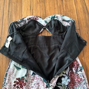 Elegant strapless dress with floral print. Features a cutout detail. Perfect for special occasions.