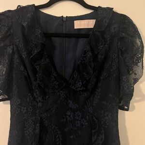 Stylish midnight blue dress with elegant design. Ideal for special events. Beautiful lace details and fully lined