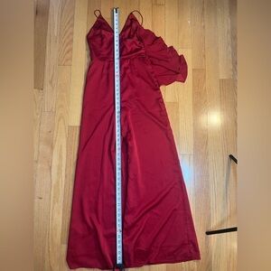 Stunning red satin jumpsuit. Wide leg, adjustable strap. Billowing ruffle detail.