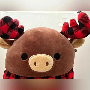 Alfred the Reindeer is a brown Squishmallow from the Christmas Squad. Alfred is a brown deer. He has large,red-squared quilt patterns antlers with the same color as the scarf which stand tall on his head and curve inwards. His muzzle, belly and inner ears are all a light, sandy color. He has round, black eyes and brown nostrils.