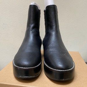 Genuine leather flat form bootie with elastic gore detailing and ombre heel treatment. Latex padded footbed. Round toe.