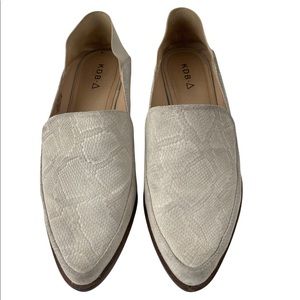 Suede, snake embossed loafers with collapsible smooth leather heel. Wedge , stacked heel. EUC condition. Some soiling. See pics.