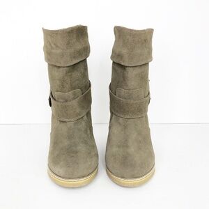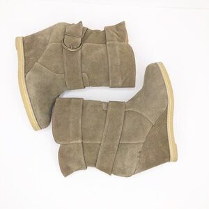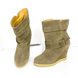 Kelsi Dagger suede wedge ankle boots with buckle at the side, 100% suede, very good condition gently pre-owned just two small minor spots on the right boot above the heel as shown in image, and just a little of the inner lining peeled off as shown in images.