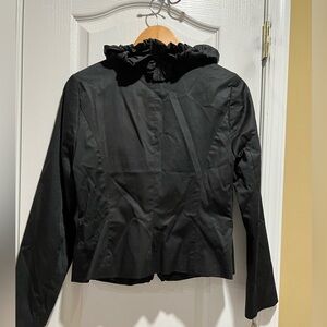 KENAR Dressy Evening Blazer Jacket small Black Pleated Ruffle Neck Hook & Eye. 21” long, 19” wide. Cotton blend. Smoke free home.