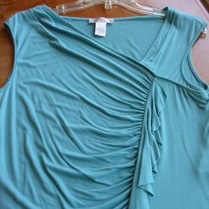 Pretty teal (more green than blue) colored top with asymmetrical neckline and ruched front for soft, flattering fit with lots of stretch. 95% viscose, 5% spandex, evry soft feel machine wash. Excellent like new condition.