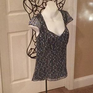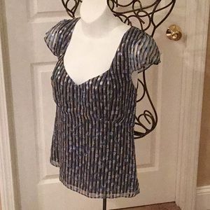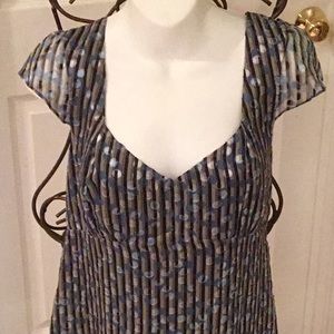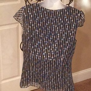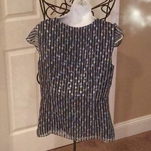 SUPER NICE MULTI COLORED TOP WITH DARK BLUE, LT. BLUE, WHITE AND GRAYS COLORS..